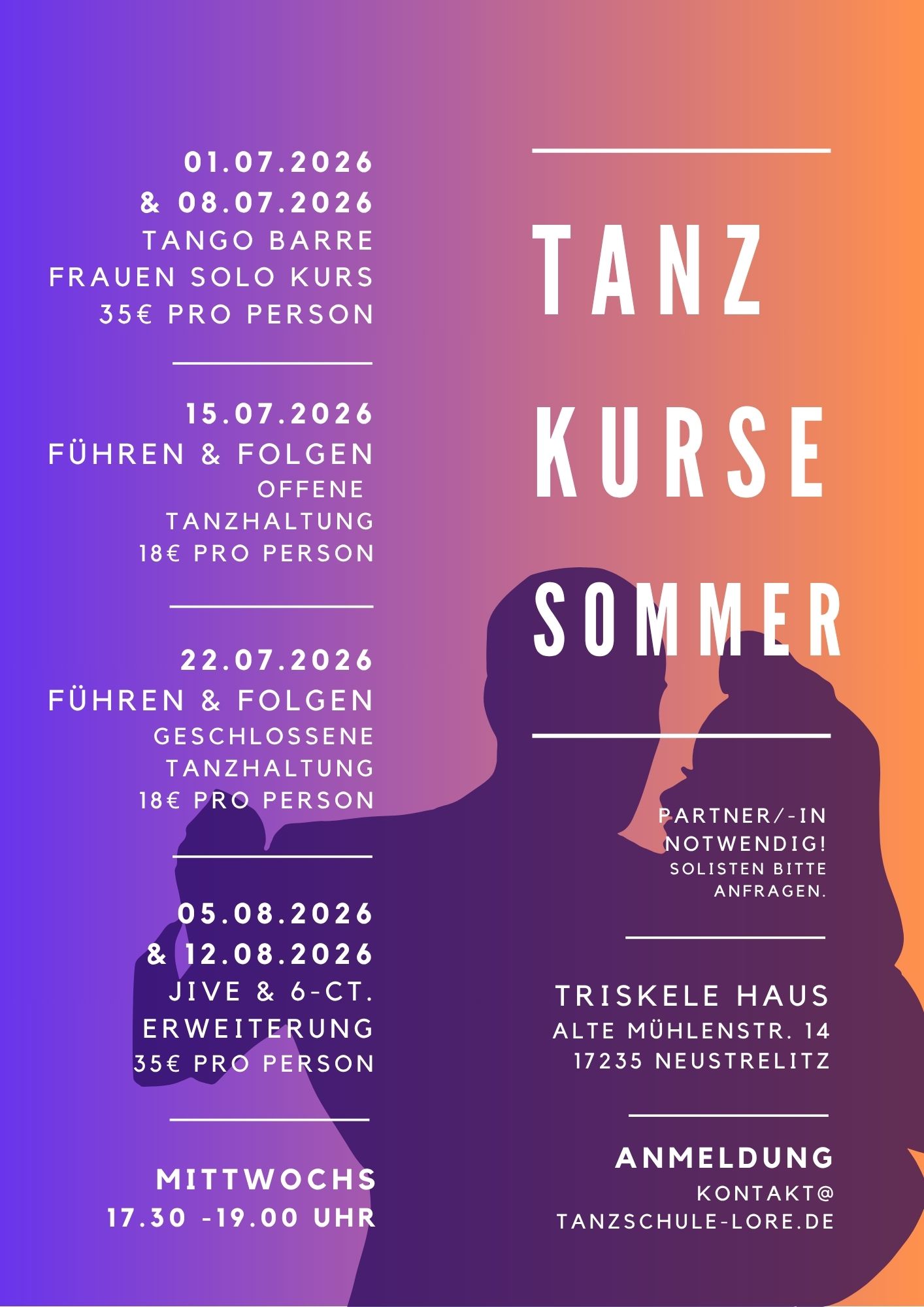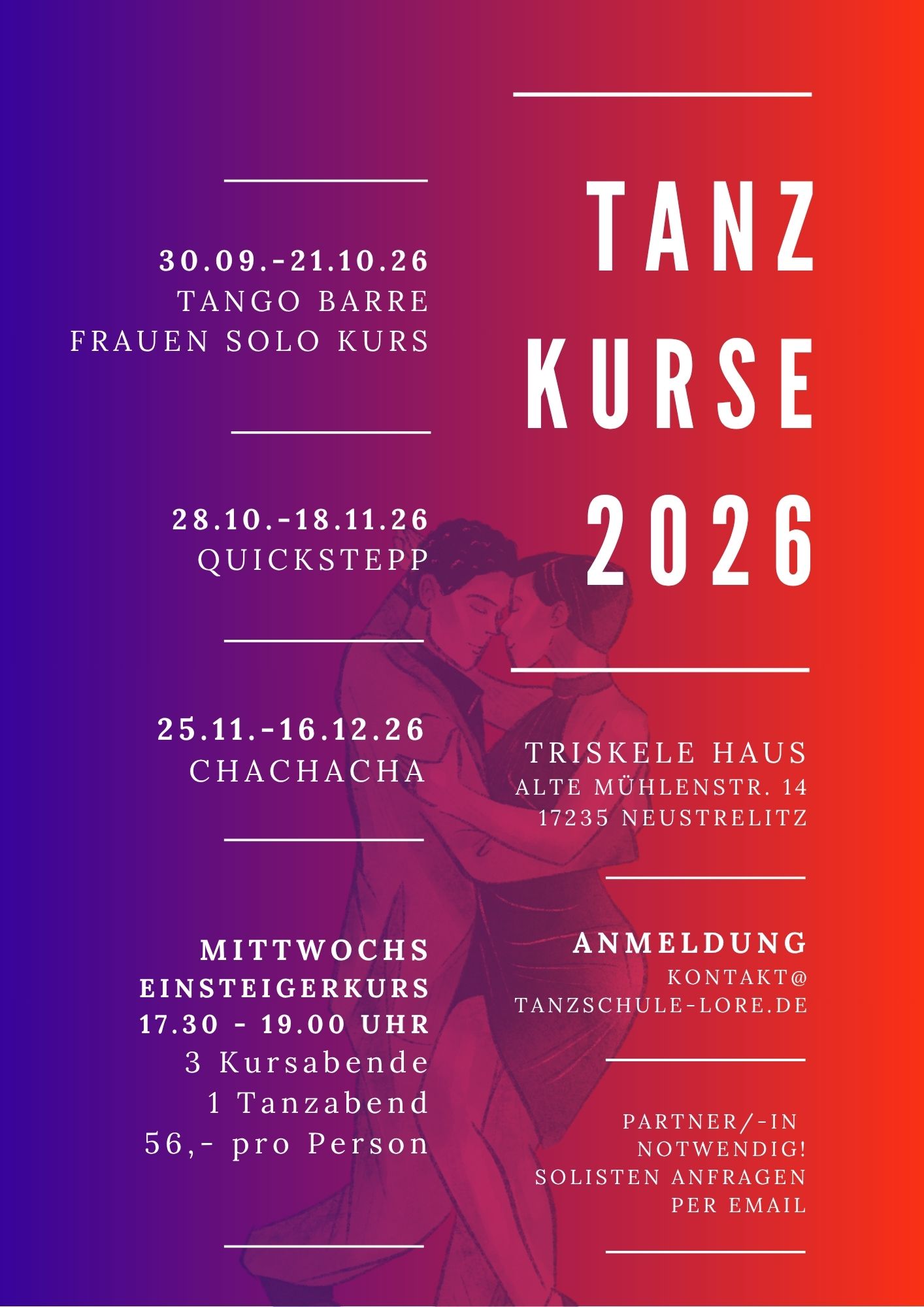 Alte Mühlenstraße 14 • 17235 Neustrelitz • Telefon: +49 3981 349503 (Dienstags) • Handy: 017629160917 • E-Mail: kontakt@tanzschule-lore.de